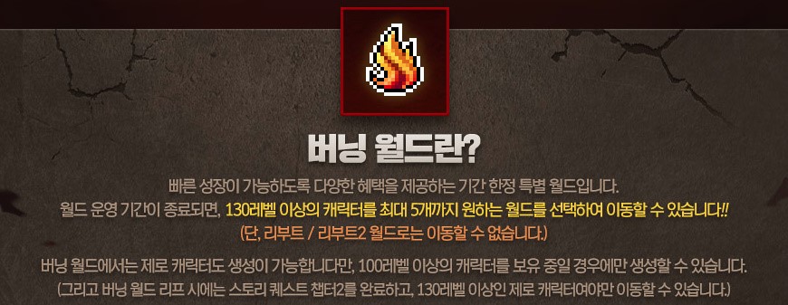 앞서 언급한 내용과 같이 기간 한정 월드이기 때문에 육성 운영 기간이 종료되면 다른 월드로 리프 시켜줘야 생성한 캐릭터의 지속 육성이 가능 합니다. 월드 리프 조건은 130레벨 이상의 캐릭터이며 최대 5개까지 이동됩니다. 버닝 월드 리프 기간에 이동하지 않으면 캐릭터가 삭제될 수 있으니 버닝 월드에서 게임을 즐기신다면 운영 기간을 꼭 체크하시길 바랍니다.