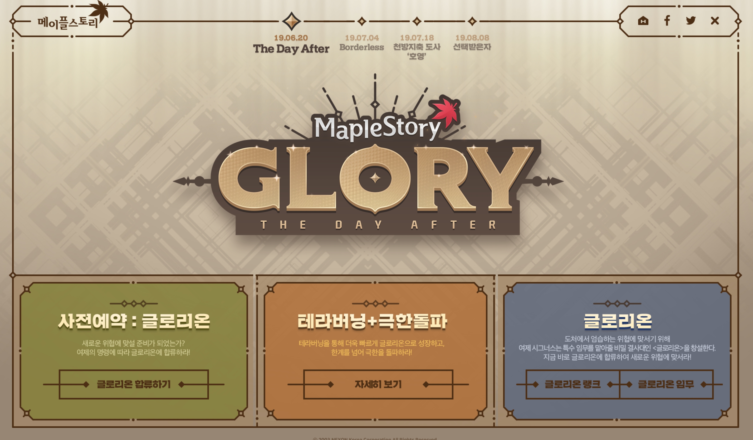 메이플 연합이 검은마법사에 승리를 거두긴 했지만, 여전히 위협이 남아 있는 메이플 월드. 위협으로부터 메이플 월드를 지키기 위해 정예 특수 팀 '글로리온'이 탄생한 것이 이번 업데이트의 주요 내용입니다. 글로리온은 메이플 연합 전초기지를 베이스로 하여 다양한 미션을 수행하게 됩니다.