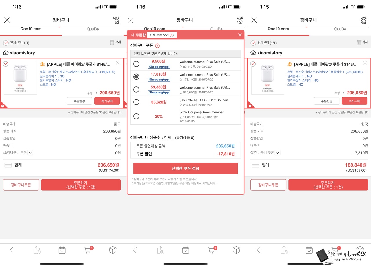 - 큐텐 해외직구 : 무선 충전 에어팟 가격 - 188,840원 (장바구니 쿠폰 추가 할인시)