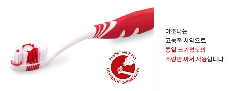 국내에서 일반적으로 구할 수 있는 치약과 비교하면 그 용량이 워낙 작아 처음 쓰는 이들은 난감해 하기도 하지만, 사실 아조나치약은 고농축이라 아주 소량(약 0.2g 정도)만 발라서 사용을 하면 되요.