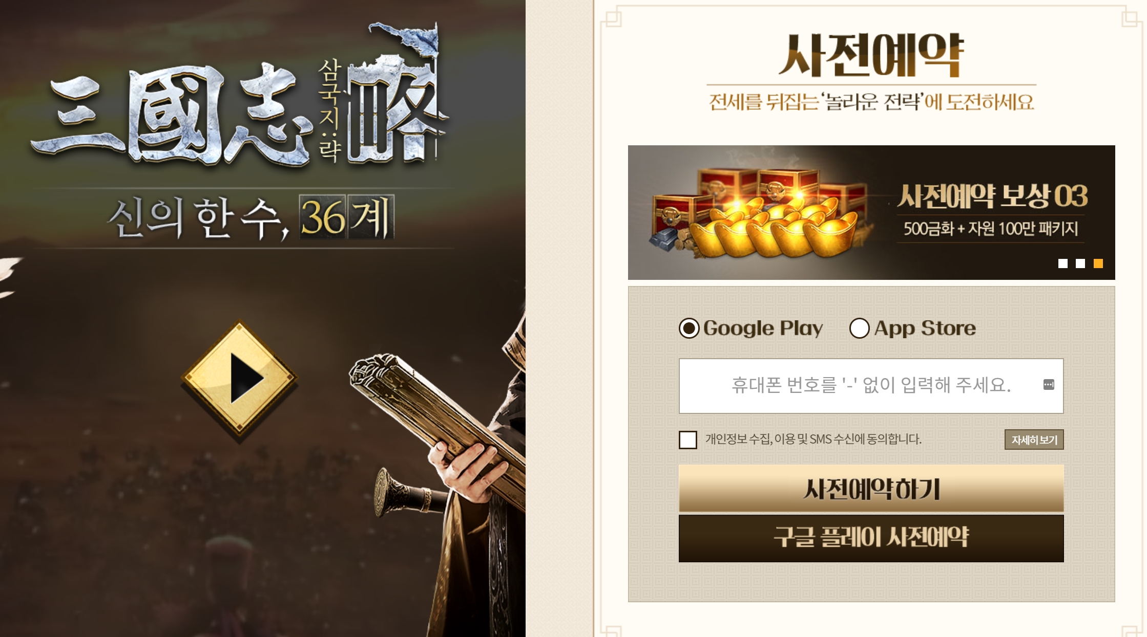 구글 플레이 및 앱스토어 모두 신청이 가능한데요. 사전예약 보상으로 3성 조운 조각 170개, 전법 랜덤 패키지 30개, 500금화, 자원 100만 패키지가 주어지네요. 상당히 풍성한 모습입니다.