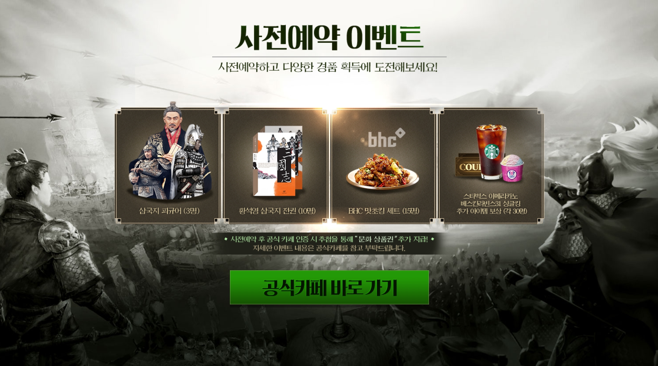 방금 말한 혜택 외에도 추가로 추첨을 통해 경품을 얻는 행운의 대상이 될 수도 있어요. 삼국지 피규어, 황석영 삼국지 세트, BHC 맛초킹 세트 등이 지급됩니다.