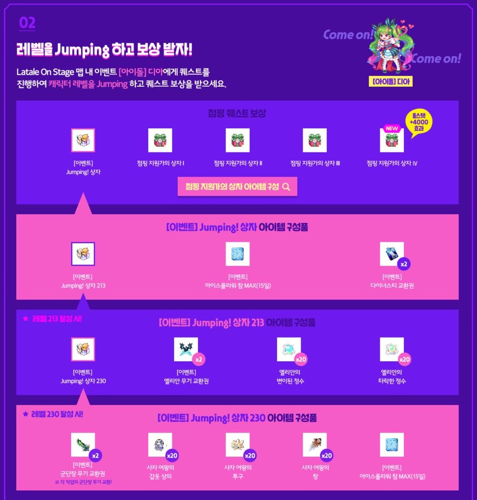 이를 받은 다음 게임에 접속해서 Latale On Stage 맵 내 이벤트 아이돌 디아에게 퀘스트를 진행하면 레벨을 205로 점핑할 수가 있습니다. ▼