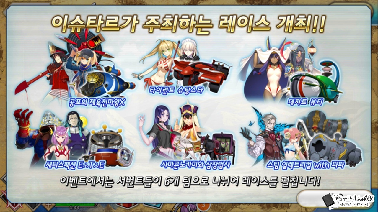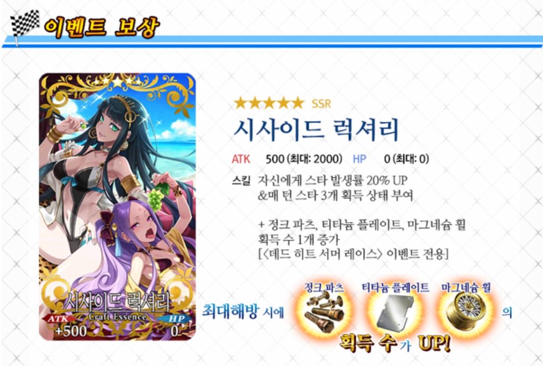 방금 소개한 픽업 이벤트 뿐만 아니라 페그오에는 또 하나 눈길을 끄는 이벤트가 있습니다. 바로 데드 히트 서머레이스! 꿈과 희망의 이슈타르컵 2019 인데요. 첫 미션인 특이점F 영상오염 도시 후유키만 클리어해도 참여가 가능하기 때문에 진입장벽이 낮은 특징이 있습니다. 즉, 초보라도 참여할 수 있어요!