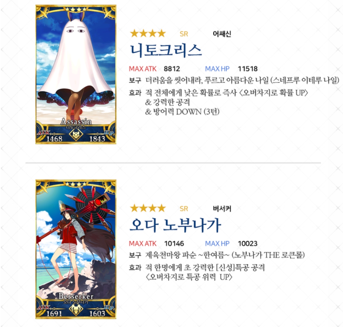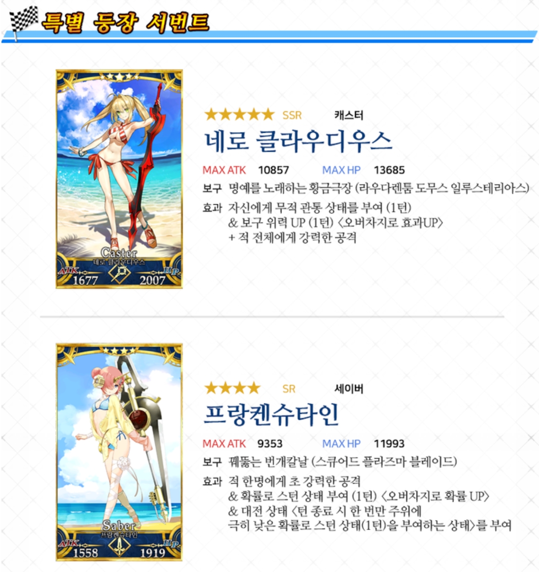 픽업 이벤트에 대한 것 부터 짚어볼까요. 7월 31일부터 오는 8월 23일까지 3주 동안 진행되는 행사에서는 네로 클라우디우스 캐스터, 프랑켄슈타인 세이버, 니토크리스 어쌔신, 오다 노부나가 버서커 등이 새롭게 등장합니다.
