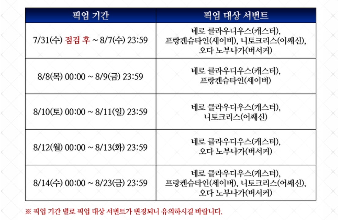 아래 도표를 보면, 각각의 서번트를 얻을 수 있는 기간이 정해져 있음을 아실 수 있을 텐데요. 7일까지, 14일~23일 기간에는 모두 픽업이 가능하니 알아두시면 도움이 될 듯 합니다.