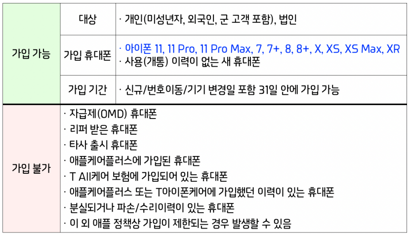 이는 SKT가 애플과 제휴해 단독으로 선보이는 특별한 보험 상품인데요. ‘애플케어플러스(AppleCare+)’ 보상 혜택을 더욱 풍성하게 구성한 상품이라 이해를 하시면 될 것 같아요. ▼