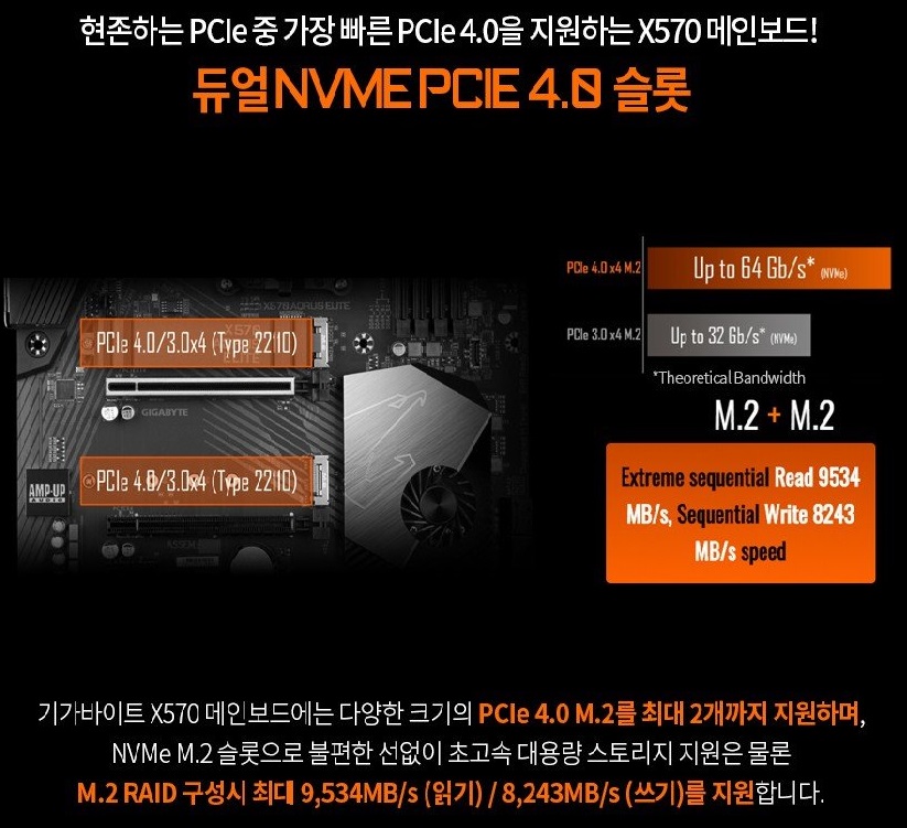 | 1) PCIe 4.0 인터페이스로 대역폭과 전송속도 최대 두배 상승 2) 기존 PCIe 3.0 속도 3.94GB/s를 뛰어넘는 5GB/s 속도 제공, 대용량 파일을 보다 빠르게 전송 가능 3) 기존 2.5인치 SATA-3 SSD에 비해 최대 9배 이상 빠른 성능 4) 최대 읽기 성능 5,000MB/s, 최대 쓰기 성능 4,400MB/s 5) AMD X570 기반 3세대 라이젠 프로세서, PCIe 2.x / 3.x 와 호환 가능 6) 5년 기간 A/S 제공 |