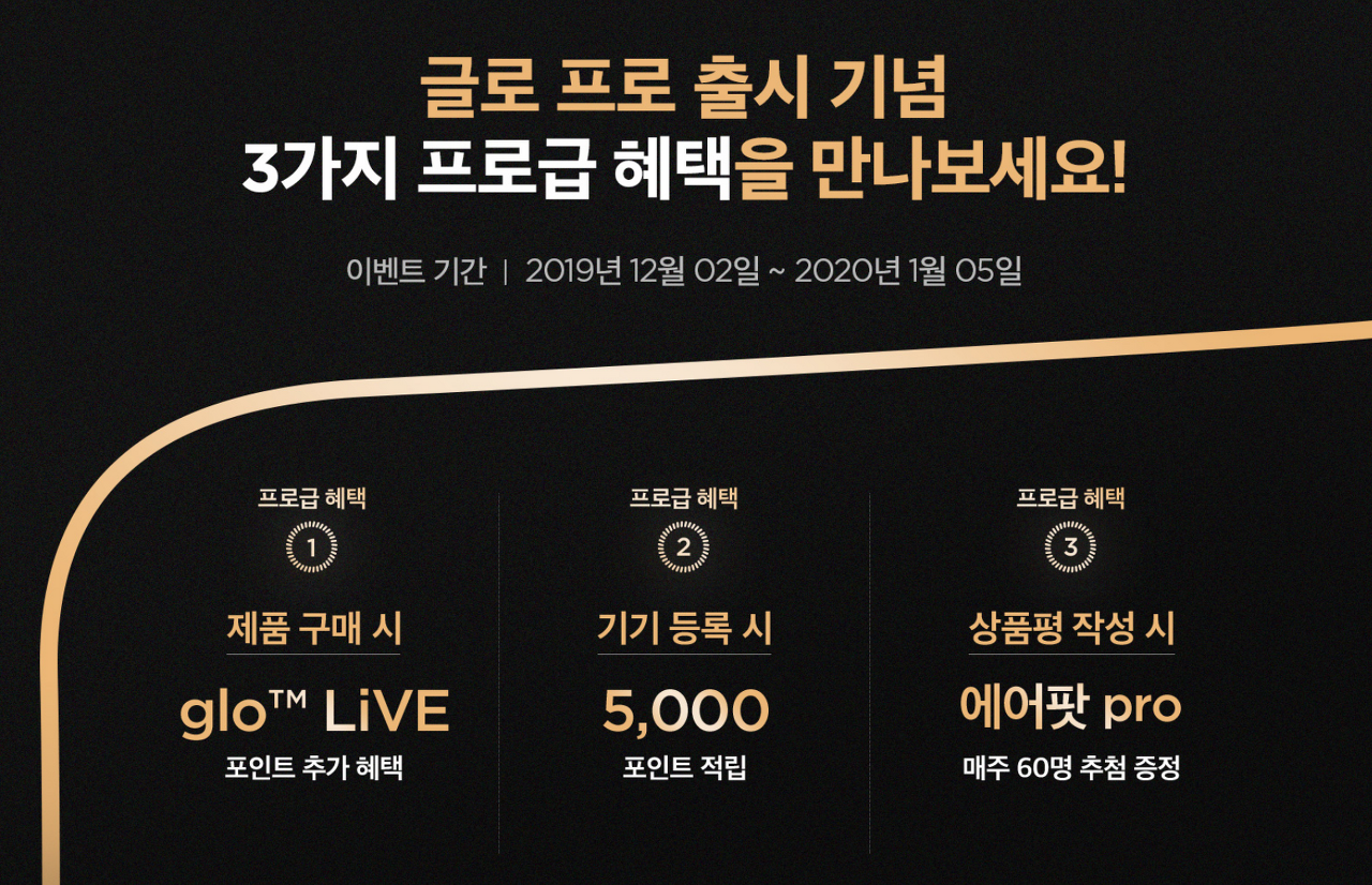한편, 글로2와는 또 다른 매력으로 새롭게 출시된 글로 프로. 이 녀석은 지금 온라인 스토어에서 구매 시 다양한 혜택을 받을 수 있습니다. 오는 1월5일까지 다양한 이벤트들이 진행되고 있는데요.