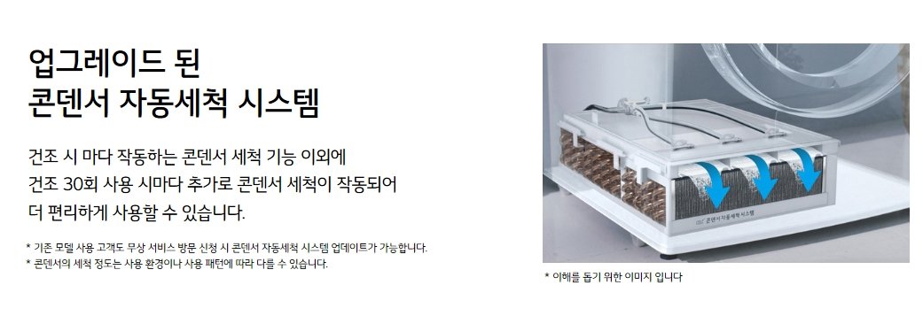 아는 분들도 있겠지만, 시중에 판매되고 있는 건조기 가운데 상당수는 콘덴서를 직접 세척해야 하는데, 날카롭고 뜨거운 콘덴서를 일반 가정에서 소비자가 청소하는 것은 위험할 뿐 아니라 솔로 청소할 경우 되려 콘덴서가 손상될 위험도 있습니다.