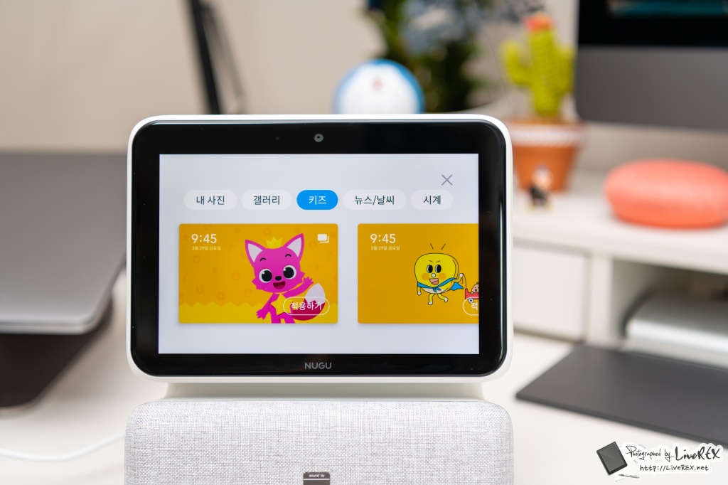 참고로, 디스플레이가 있다는 특징을 살려서, 휴대폰의 NUGU app 을 통해 휴대폰 사진을 NUGU nemo (7인치 화면)의 배경화면으로 설정할 수 있습니다. 최대 50장까지 가능하며, 사진 한 장당 10초~10분으로 설정이 가능한 게 특징이예요.