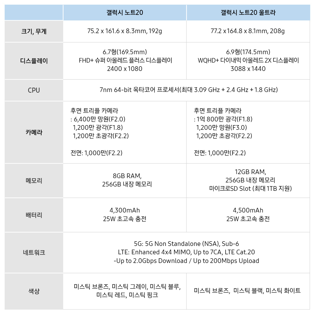 다들 아시겠지만, 이번 갤럭시 노트20 시리즈는 갤럭시 노트20 울트라와 갤럭시 노트20 2종으로 출시됩니다. 각각의 핵심되는 스펙은 아래와 같습니다. ▼