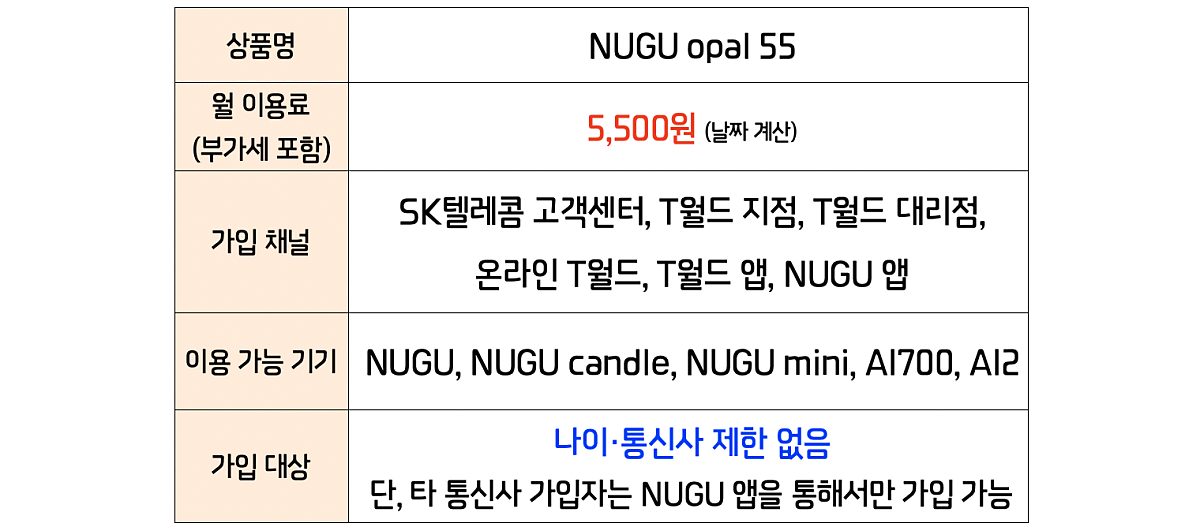 참고로, SKT NUGU opal은 월 정액 5,500원의 유료 서비스인데요. 현재는 첫 가입 시 3개월 무료 체험이 가능합니다. ▼