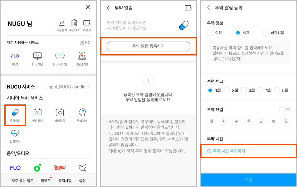 서비스 가입을 마치면 메인 메뉴에서 NUGU opal 전용 서비스를 살펴볼 수 있습니다. 앞서 언급한 투약 알림, 일정 알림, 생활 알림, 두뇌 체조 등이 표시되는 걸 알 수 있네요. ▼