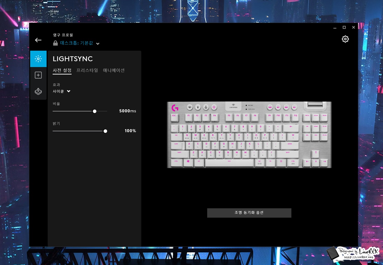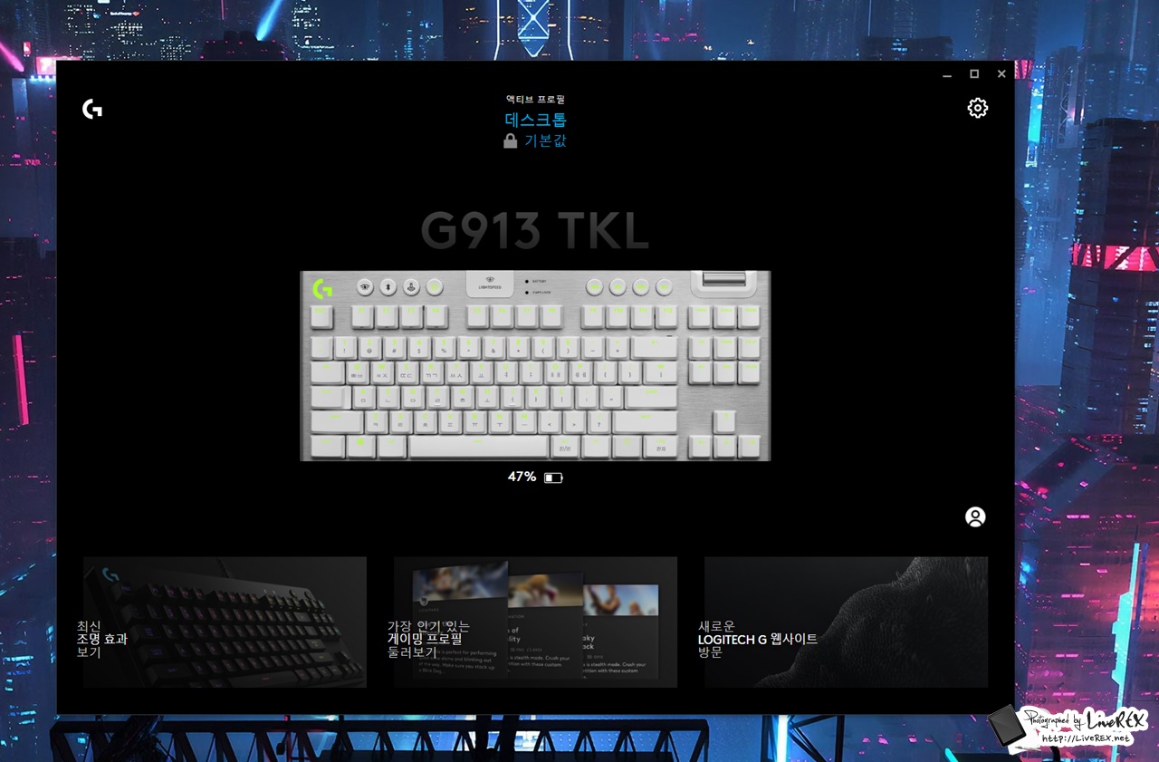 자신만의 컬러를 만들 수 있고 같은 로지텍 장비는 LIGHTSYNC로 색을 맞춰 사용할 수 있습니다. 뿐만 아니라 G키를 커스터마이즈하고, 온보드 프로파일 저장, RGB 설정 등을 하는 것도 가능해요. ▼