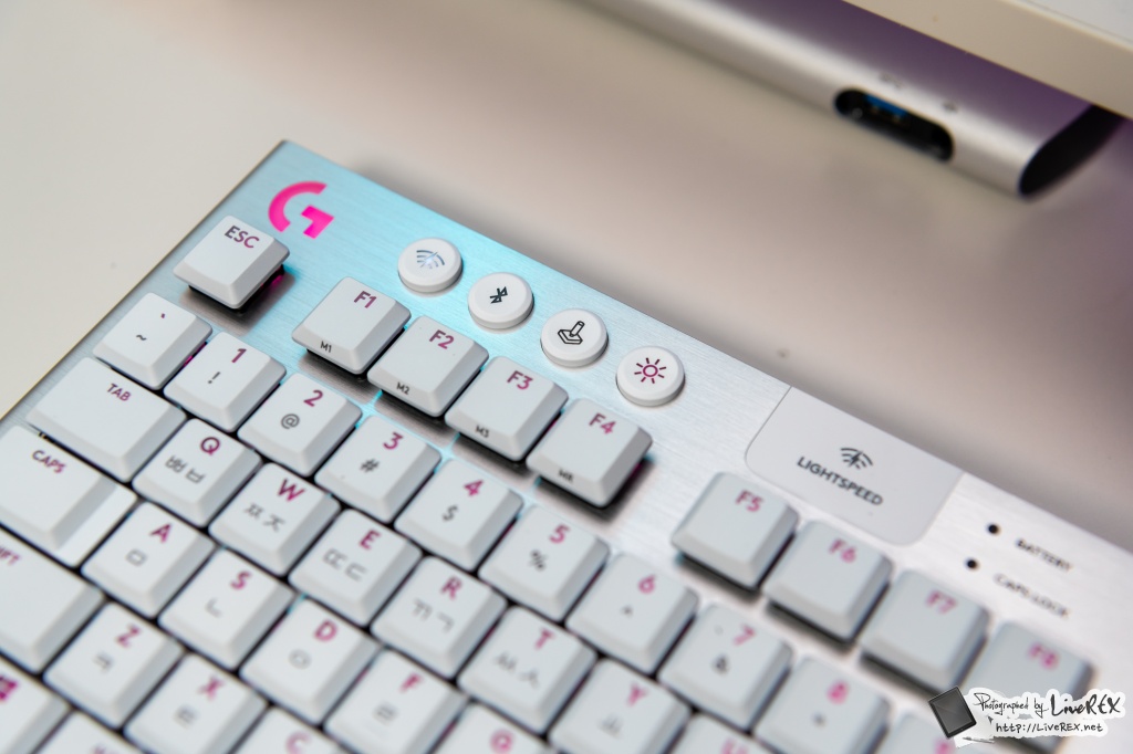 참고로, 키보드에 배터리 표시등이 있어 배터리가 낮을 때 로지텍 G HUB에서 알람을 받을 수 있는데요. 4시간 이하로 완전 충전이 가능하고 충전 중에도 사용할 수 있어요.