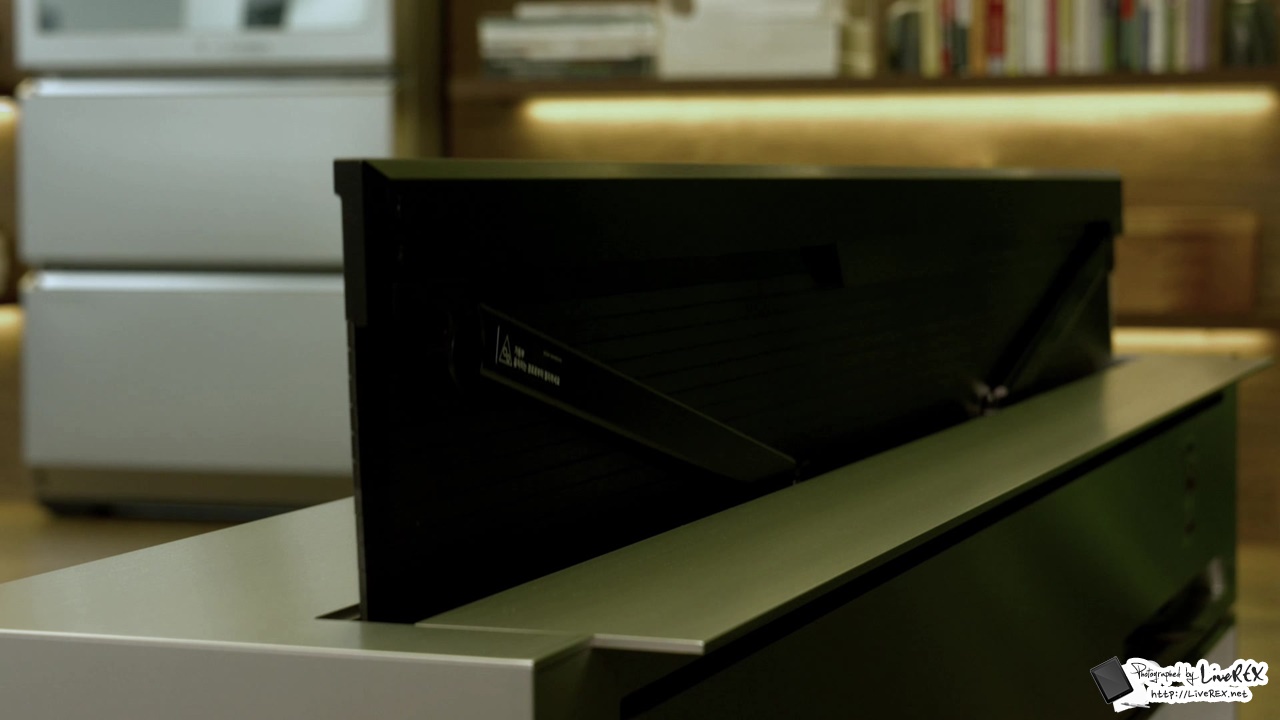 먼저, 디자인 측면에서 사이즈와 두께 등에서 이점이 있어요. 제품의 크기는 65인치이지만 화면이 모두 들어갔을 때는 높이가 불과 45cm 수준이고, 제품 두께는 5.8mm 로 지극히 얇게 처리가 됐습니다.
