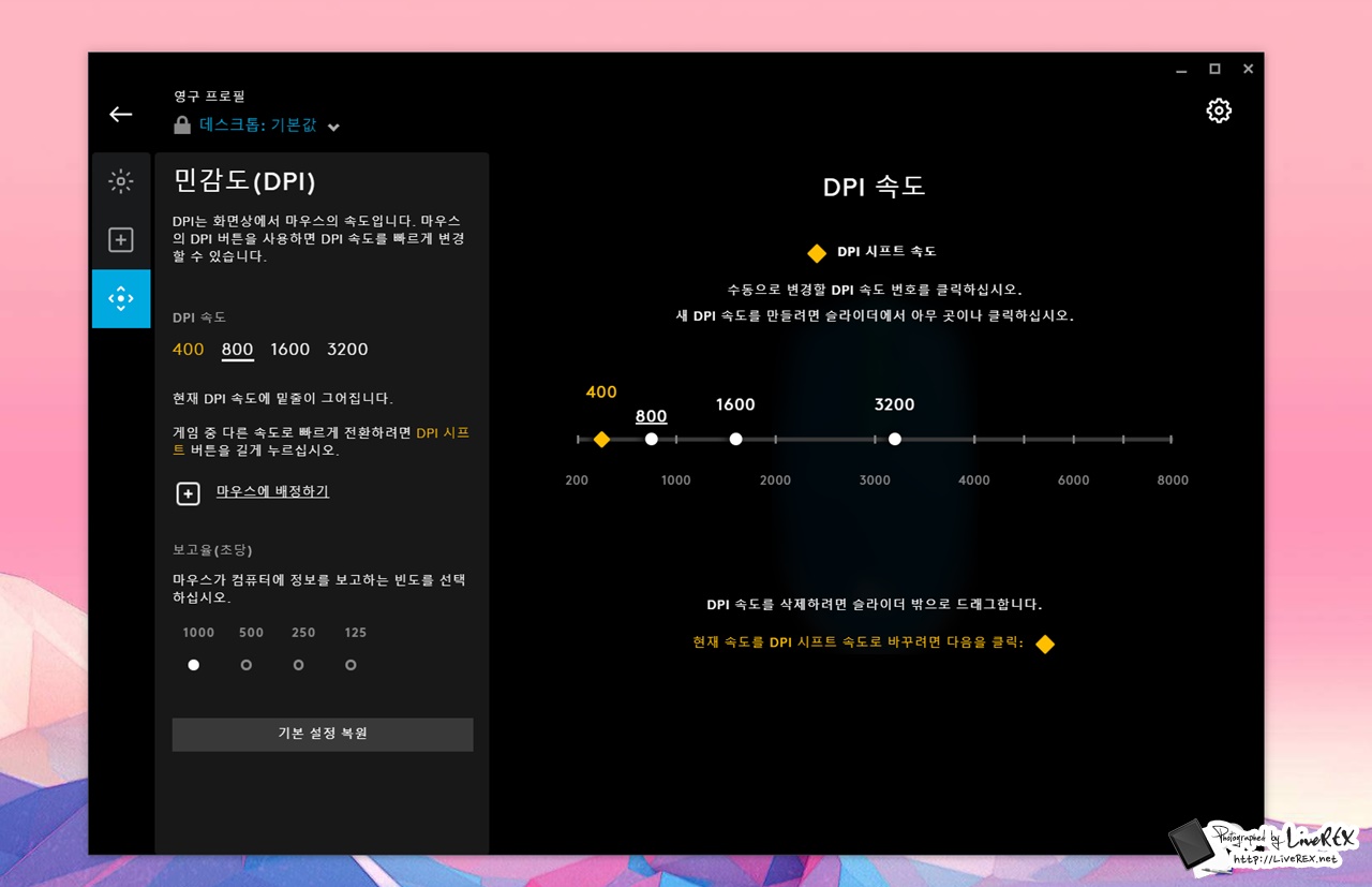 덧붙여, 앞서 말한 것처럼 5개의 DPI를 지정하고 보고율 또한 125, 250, 500, 1,000 중에서 선택할 수 있는데요. ▼