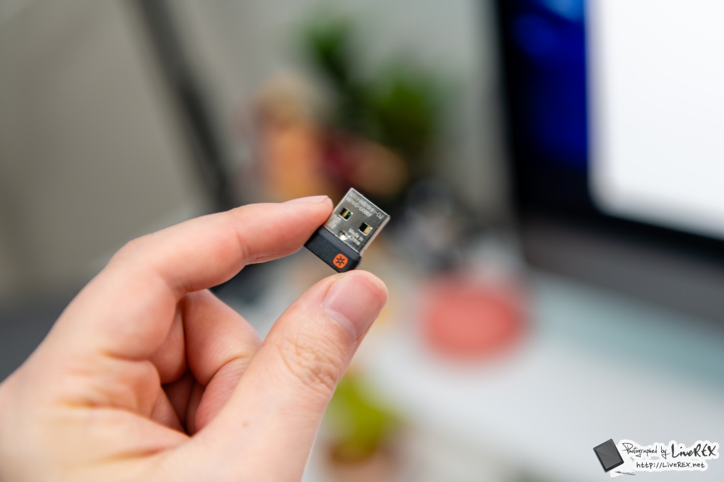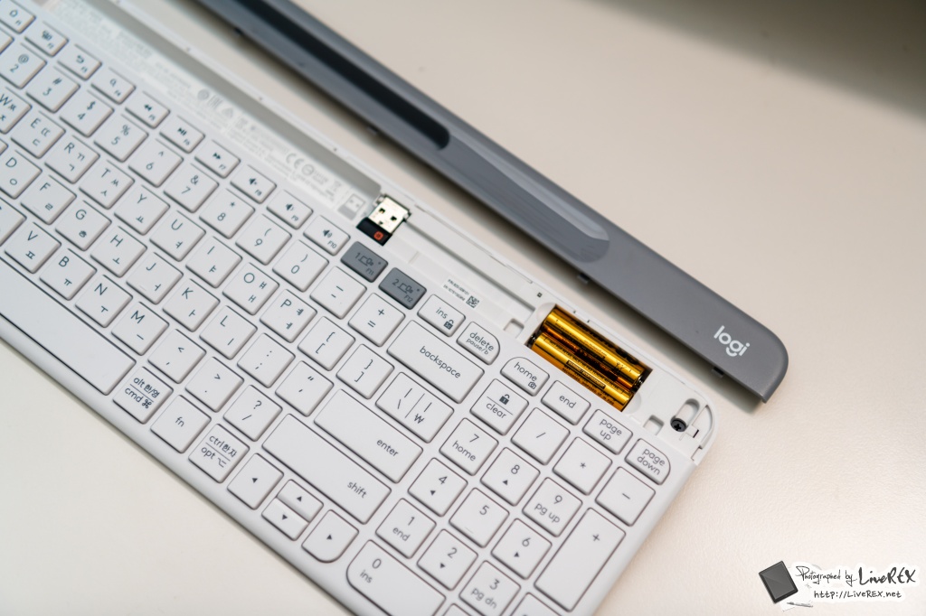 거치대 쪽을 열면 유니파잉 수신기와 배터리를 확인할 수 있습니다. 참고로, 유니파잉 수신기는 로지텍 기기 중 유니파잉 기술을 지원하는 기기 최대 6대까지 연결해서 이용할 수 있어요.