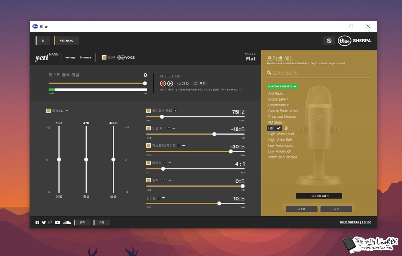 전용 소프트웨어인 Sherpa App 을 통해서 픽업 패턴, 볼륨, 다양한 프리셋 등 세부적인 설정도 가능합니다. 특히 예티 나노는 이번에 BLUE VO!CE 기능을 이용할 수 있게 업데이트되어 EQ설정과 11가지 프리셋을 제공해주어 마이크를 다양한 세팅으로 활용할 수 있습니다. 궁금한 마음에 직접 녹음 텍스트를 해보니 음성이 훨씬 디테일하면서 선명하게 담기는 것을 확인할 수 있었습니다.