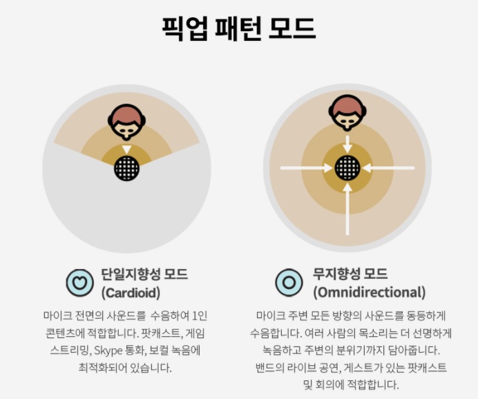 마이크에 대한 정보를 찾다보면 '지향성' 이라는 표현을 접하게 될텐데요. 이는 쉽게 말해서 특정 방향에서 소리를 수음해서 녹음이 된다는 것으로 이해를 하시면 됩니다. 블루 예티 나노는 단일지향성과 무지향성 2개의 픽업 패턴 모드를 지원합니다. 후면에 있는 버튼을 눌러서 모드 변경을 할 수 있어요.