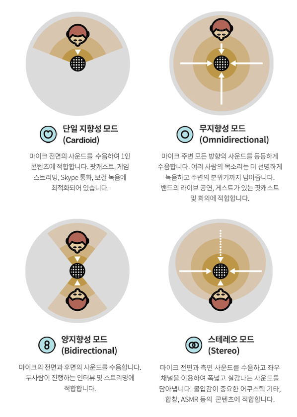 양지향성 모드는 마이크의 전후면으로 사운드 수음이 가능하기 때문에 두 사람이 진행하는 인터뷰 등에 최적화 되어 있고, 스테레오 모드는 마이크 전면과 측면 사운드를 수음하고 좌우 채널을 이용해 폭넓고 실감나는 사운드를 담아내는 특징이 있어 몰입감이 중요한 ASMR 등과 같은 콘텐츠에 효과적이라 할 수 있어요.